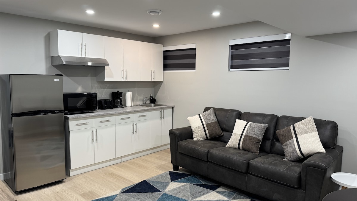 We have created a warm and welcoming ambience with the comfort of guests in mind. If you are here to explore, unwind and/or simply enjoy a change of scenery, this 1-bedroom suite features a cozy queen size bed, bathroom, living room, equipped kitchenette, and a dining crafted to give you more than just a place to sleep. It offers a warm atmosphere and relaxing environment that makes every moment feel so special. Few minutes drive to malls for shopping all you may need and free driveway parking.