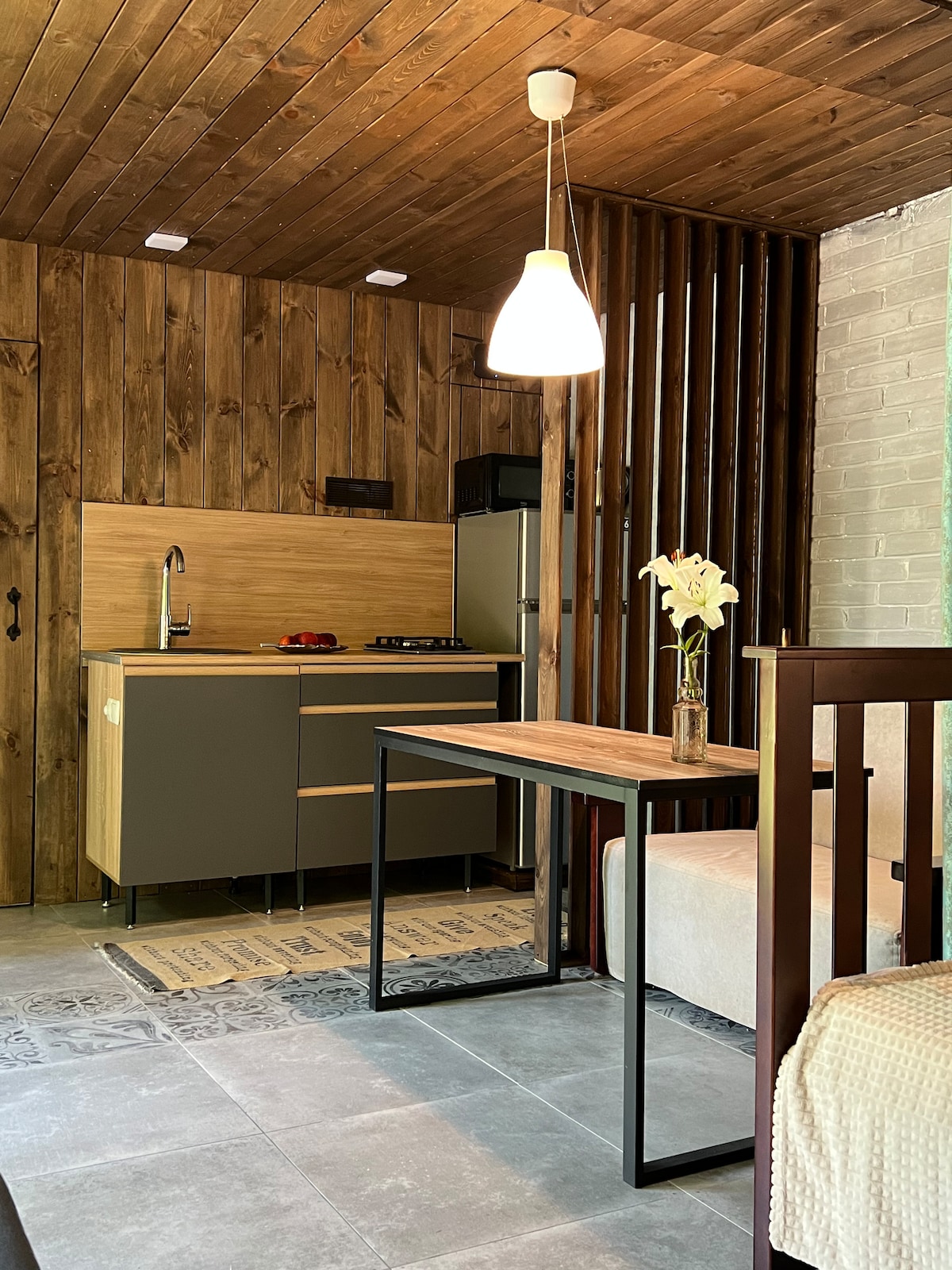 Departamentos con acceso al jardín, para aquellos que quieran sumergirse en el mundo de la naturaleza, con pájaros cantando por la mañana, tomar una taza de café bajo los pinos y descansar perezosos. Pasá tiempo con toda la familia en este alojamiento elegante y acogedor. (Primer piso de la casa de huéspedes)