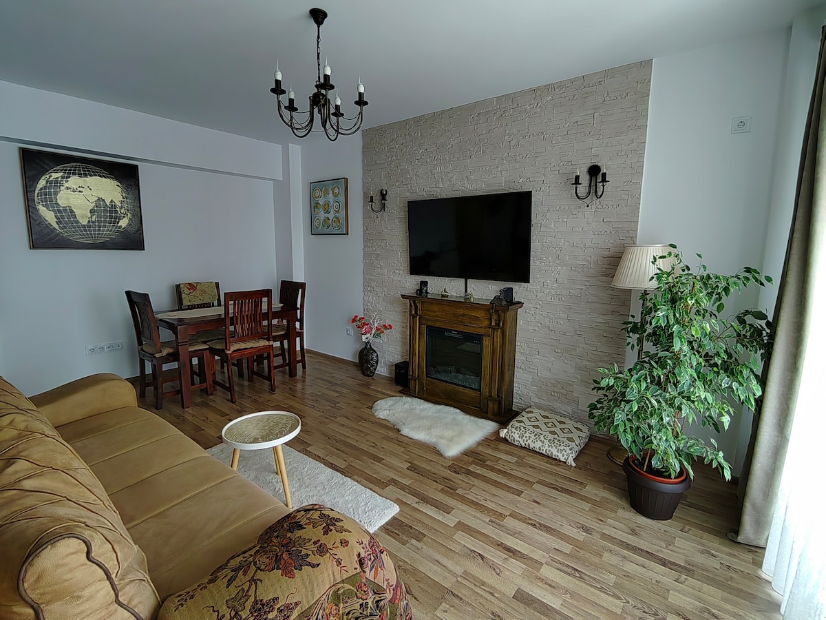 Te damos la bienvenida a nuestro nuevo y encantador apartamento ubicado en la parte «más joven» de Brasov. Totalmente amueblado, un dormitorio con una cama tamaño king generosa y un acogedor asiento junto a la ventana, un baño de estilo retro con ducha a ras de suelo, una sala de estar con bar, chimenea, un cómodo sofá y una cocina totalmente equipada, en un espacio abierto. El apartamento está a 5 minutos a pie del centro comercial Coresi y a 20 minutos en autobús del centro histórico (a 4 km de distancia). La estación de tren está a 15 minutos en autobús (2 km).