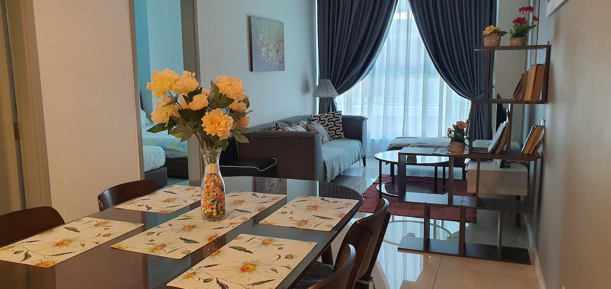Originalmente nuestro hogar de vocación familiar, nuestro lugar es muy espacioso (1700 pies cuadrados) con una renovación moderna y acogedora que consiste en una vista completa al mar con vistas al Mar del Sur de China. ¡Tiene una vista impresionante del atardecer! Estamos ubicados justo encima del centro comercial Imago más prestigioso, en el corazón de Kota Kinabalu, a solo 5-10 minutos del aeropuerto. Vas a tener acceso a un supermercado internacional y restaurantes que van desde sabores locales hasta helados cremosos. Es perfecto para familias que viajan juntas.