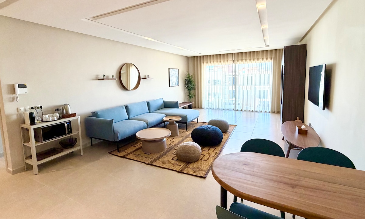 Cet appartement lumineux allie design épuré et confort haut de gamme, avec une vue sur la piscine depuis sa terrasse. Le jacuzzi privé vous offre des moments de détente inoubliables, entre bains chauds sous le soleil et soirées étoilées. Idéal pour les couples, les amis ou les voyageurs en quête de surf ou Yoga, farniente et luxe. À proximité des spots de surf et des cafés branchés, vivez une expérience 100% Taghazout : paysages magnifiques, calme absolu et couchers de soleil magiques.