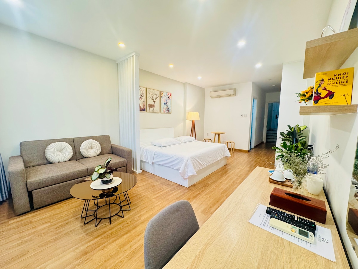 Establecidos en 2023, ofrecemos apartamentos con servicios de alta calidad para estancias cortas y largas ubicados justo en una calle concurrida con famosas cafeterías, restaurantes, Circle K y tiendas de comestibles cerca y a solo unos minutos a pie de la calle peatonal Bui Vien y del parque Tao Dan. Rentables en comparación con los hoteles, ofrecemos apartamentos de 1 dormitorio con servicios, privacidad, estilo moderno, cocina, balcón, puertas y ventanas insonorizadas, espacio de escritorio para trabajar, jardín en la azotea, ascensor, limpieza regular y las comodidades de un «hogar lejos del hogar».