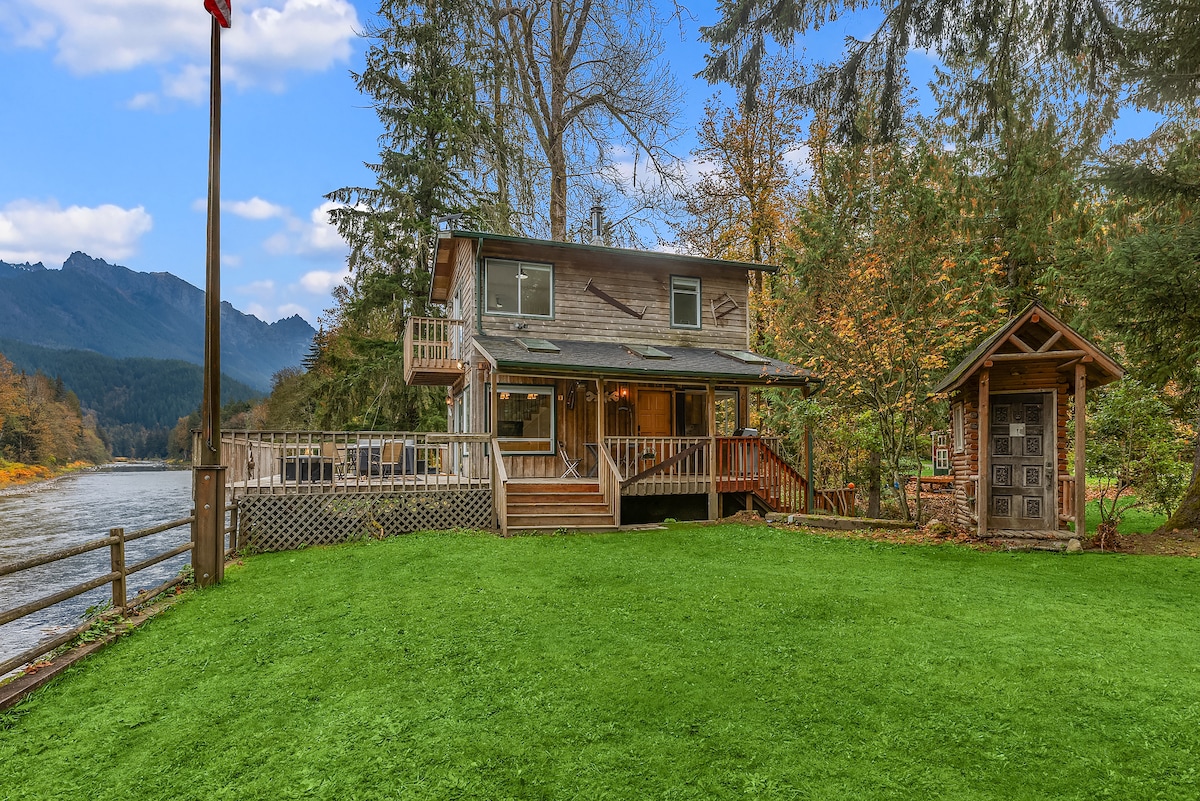 Newly-renovated, gorgeous riverfront cabin in the Cascade Mountains right on the Skykomish River. Enjoy stunning views of Mt. Index as you relax by the fire pit or on the epic wraparound deck for a hot tub soak, outdoor shower and grill-out, and enjoy the luxe mountain-modern space inside: sauna, king bed, loft queen, new kitchen, and more! 30sec to epic waterfalls, 2min to great hikes, 25min to ski Steven’s. Pet-friendly w/ fee. Book Three Peak Cabin next door for expanded group memory-making!