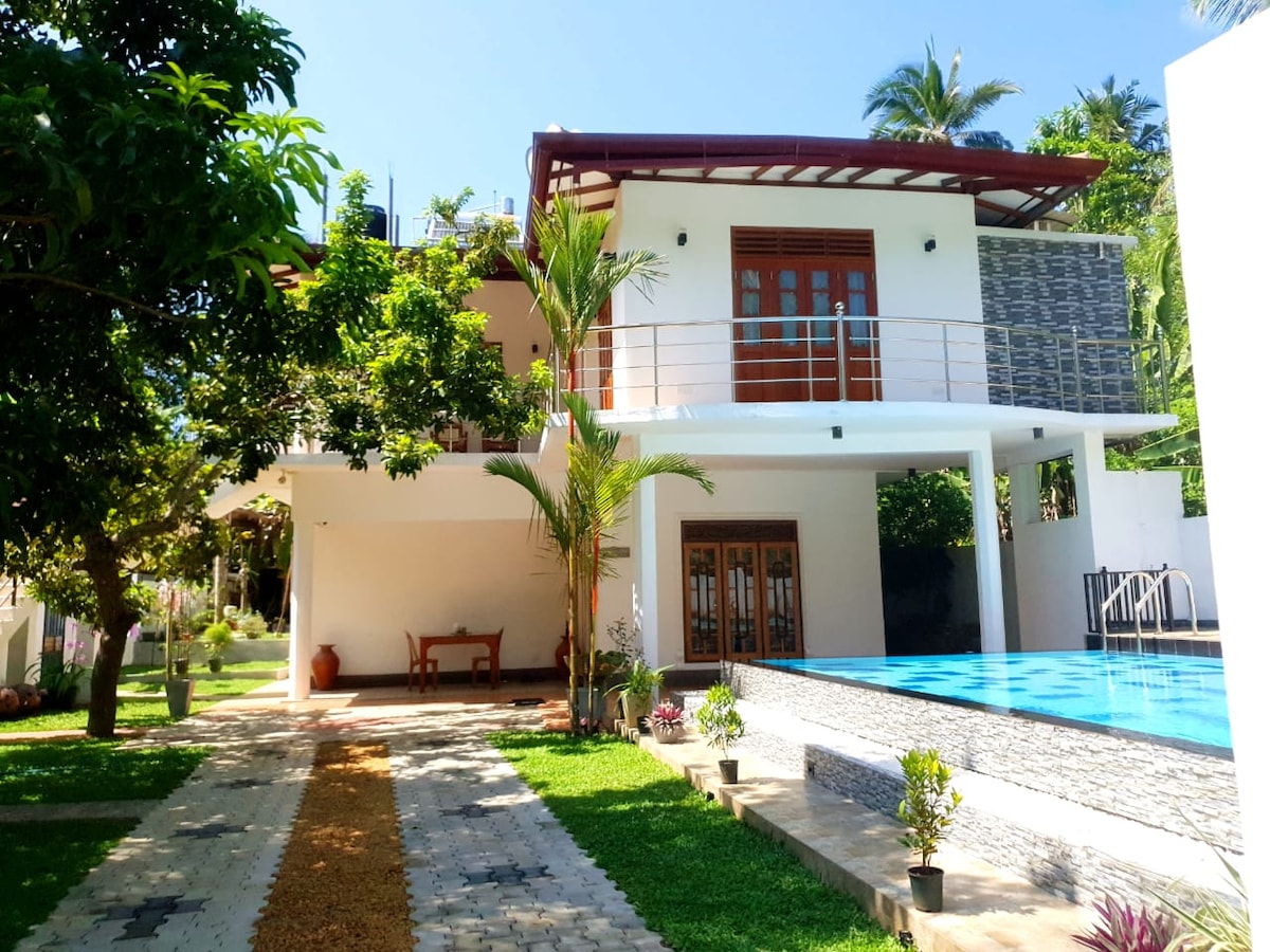 Tabla de turismo y certificación segura para el covid-19. Situado a 150 metros del océano en una zona serena y privada. Ofrecemos aire acondicionado, agua caliente, despensa, gas, barbacoa, lavadora, nevera, piscina privada y jacuzzi, Air Port Pickup & Drop se cobrará en tarifa barata. (Nota : puedes utilizar el jardín y toda la planta superior). A 6 km del río Bentota / Madu. A 45 minutos de Hikkaduwa, Galle Fort y Unawatuna, deportes acuáticos, granjas de tortugas, etc. están cerca. Desayuno no proporcionado a menos que se solicite especialmente ($ 5each).