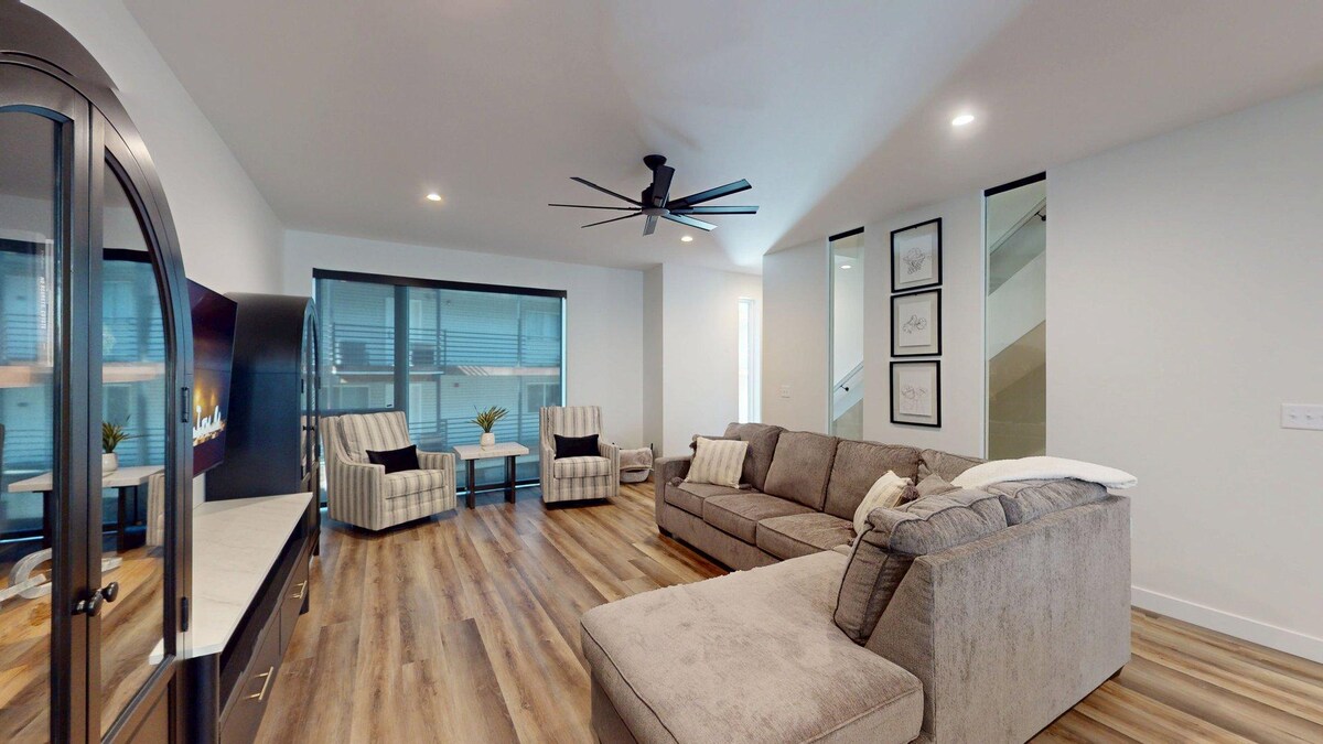 Con una ubicación céntrica, cerca de una parada de autobús, senderos para bicicletas y tiendas, este espacioso condominio tiene 2 dormitorios, 1,5 baños y un sofá cama adicional para huéspedes en la planta baja. Un espacio de trabajo exclusivo te permite trabajar fuera de casa. Relájate en la cubierta exterior o siéntate frente al televisor de 65pulgadas para ver tu servicio de streaming favorito. Por las mañanas, disfruta de la estación de café totalmente equipada. En la planta baja hay una lavadora y una secadora, así como un garaje para dos autos.