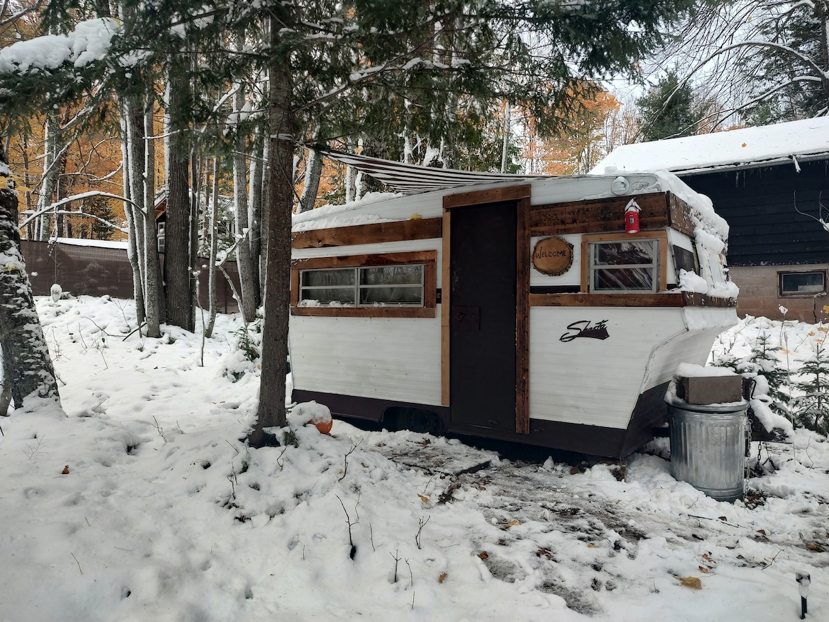 An outdoor enthusiasts dream awaits at Rockhound Hideaway's Sodalite Shasta with opportunities for snowshoeing, skiing, hiking, and ending the day with a steamy sauna. This off grid, cozy 14' trailer is situated on a two acre lot with two other rentals and my full time residence on the edge of the Ottawa National Forest. A short walk to Black River Harbor, the North Country Trail & Lake Superior, this is a perfect getaway for those seeking a rustic yet comfortable stay with a campy feel.