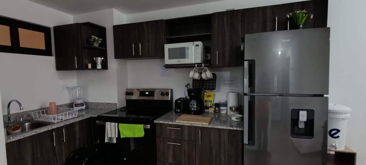 Apartamento entero tipo Loft. Cuenta con una hermosa terraza, 1 dormitorio abierto con cama Queen y A/C, baño privado , sala, comedor y cocineta totalmente equipada, lavadora y secadora de ropa. Con smart TV de 58" para entretenimiento y wifi. Incluye 1 parqueo gratuito en las instalaciones.