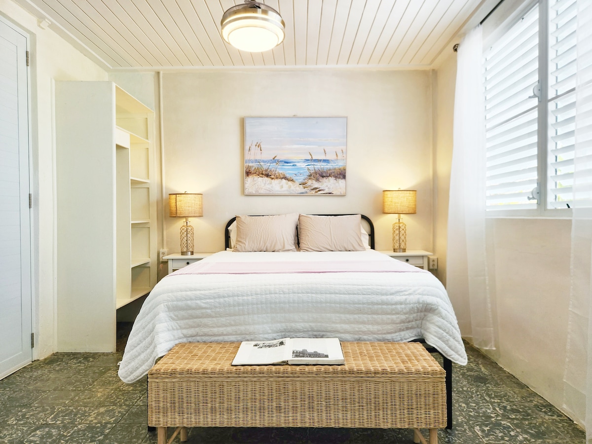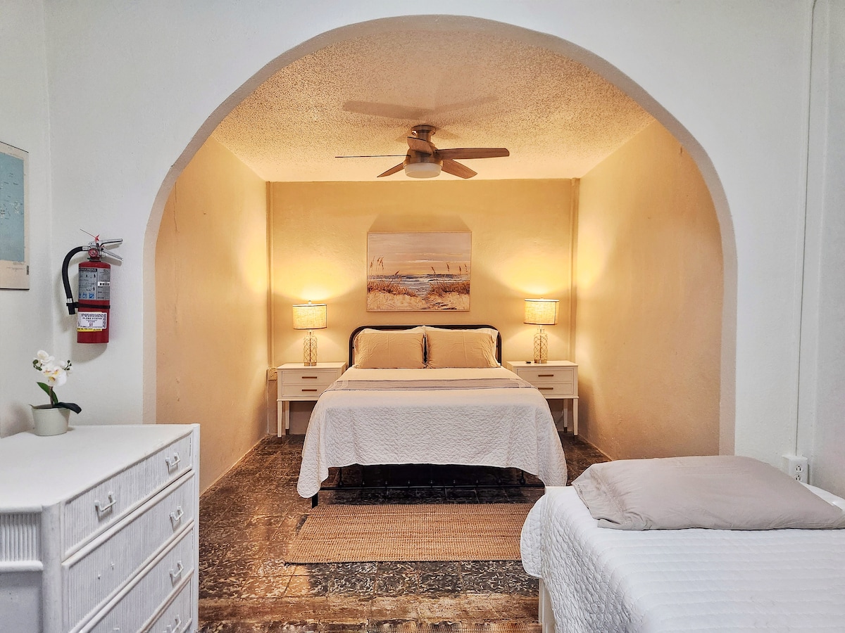 Hora de llegada: 3:00p.m. Hora: 11:00AM. $ 50 temprano/check-in tardío Amplio apartamento de eficiencia con aire acondicionado para un máximo de 5 huéspedes con cama tamaño king, litera y sofá cama. La tarifa inicial es de $ 110 por 2 huéspedes y aumenta $ 20 por cada huésped adicional hasta 5. baño, cocina pequeña con cafetera, horno tostador, placa calefactora, nevera, microondas, WiFi, televisión Netflix, utensilios, patio, parrilla de carbón y entrada privada. Los huéspedes tienen acceso a sillas de playa, neveras y ducha exterior adicional.