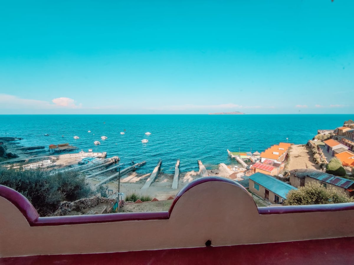 Estamos ubicados en la playa de Challapampa en el lado norte de Isla del Sol Bolivia, La habitación tiene vista al lago Titicaca y a la playa, habitación con baño privado y ducha con agua caliente y wifi. Desde aquí usted podrá visitar la zona de ciudad sumergida, la Chinkana y acceder al camino colorido hacia el sur de isla del sol.