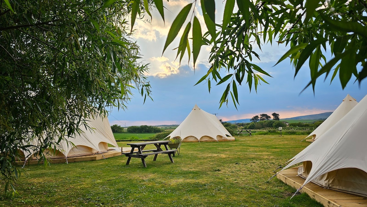 15% off Ferry travel. Our spacious Bell tents sleep a family of 4 with fully made beds, 1 double, 1 standard single & 1 camp bed. With Everything included to create a perfect camping trip. 240v electrics, Mini fridge, Tea, coffee, crockery, and cooking equipment. Warren Hill camp is on an old Dairy Farm with stunning scenery, where you can relax and watch the sun go down.
