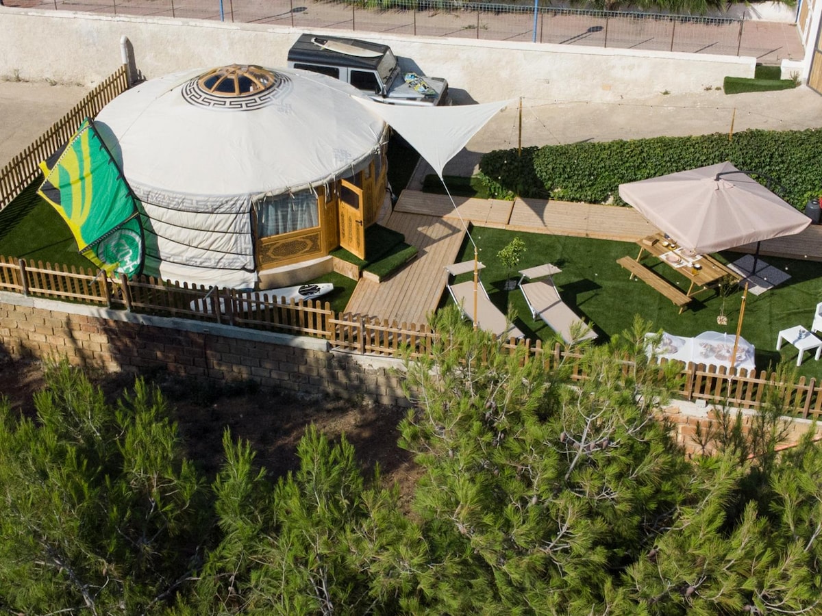 Hermosa yurta rodeada de naturaleza con vistas al mar en el horizonte. Dentro de la yurta hay una gran cama doble con baño privado, aire acondicionado, ventilador y nevera. En el exterior hay un jardín privado con cocina, barbacoa, tumbonas y mesa familiar. Estacionamiento privado justo enfrente. El desayuno casero está incluido y se entrega en la yurta. Encontrarás pan fresco, magdalenas, mermeladas, fruta y jugo de fruta, y encontrarás todo el equipo para preparar café y té por tu cuenta.