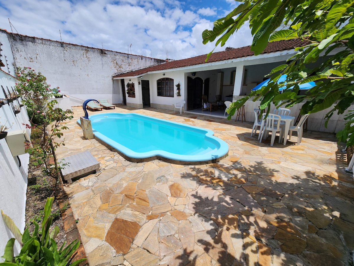Esta casa del pasillo está completa, tiene dos suites con literas, ventilador de techo, cocina completa, sala de estar, piscina, zona de barbacoa y sala de juegos. Un garaje espacioso y cubierto. Los propietarios vivimos en la casa principal. Los huéspedes tienen total libertad y privacidad en el ediculo. Estamos cerca del mar, aproximadamente a 10 minutos de la playa central de Itanhaém/SP. Barrio tranquilo de lugareños, con negocios cercanos. Puerta automática extremadamente segura, con control, pared cerrada.