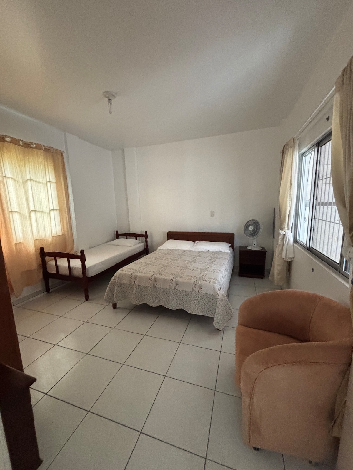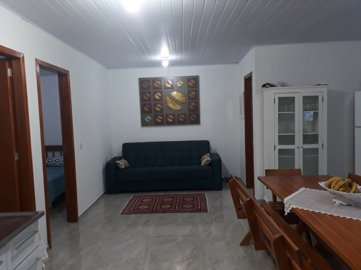 Estamos a menos de 10 minutos a pie de la playa central, mercados, farmacias, panaderías y Praça da Paz. La casa tiene un dormitorio con una cama doble, una cama individual, TV y aire acondicionado. En el living, una cómoda cama doble para dos personas más. Por ahora, solo hay aire acondicionado en el dormitorio y un ventilador en el living. La cocina está totalmente equipada, la lavandería tiene una lavadora y hay una parrilla. Lamentablemente, no ofrecemos estacionamiento, pero frente a la casa hay espacios disponibles.