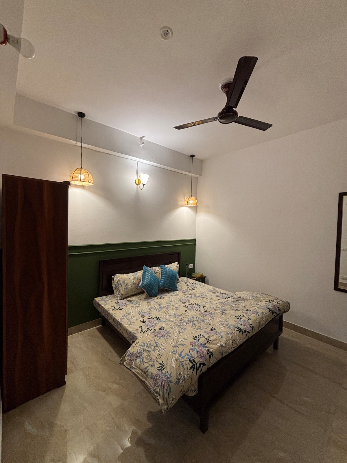 Welcome to this beautifully designed studio apartment located in the heart of Greater Noida West. Perfect for solo travelers, couples, or business guests, this studio offers a comfortable stay with all modern amenities. What You’ll Love: Spacious, well-lit room with a luxurious queen-sized bed. Elegant ceiling design with ambient lighting and stylish fans. Smart TV with entertainment setup and cozy seating. Air-conditioned comfort. Private balcony. Refrigerator. Clean, modern bathroom.
