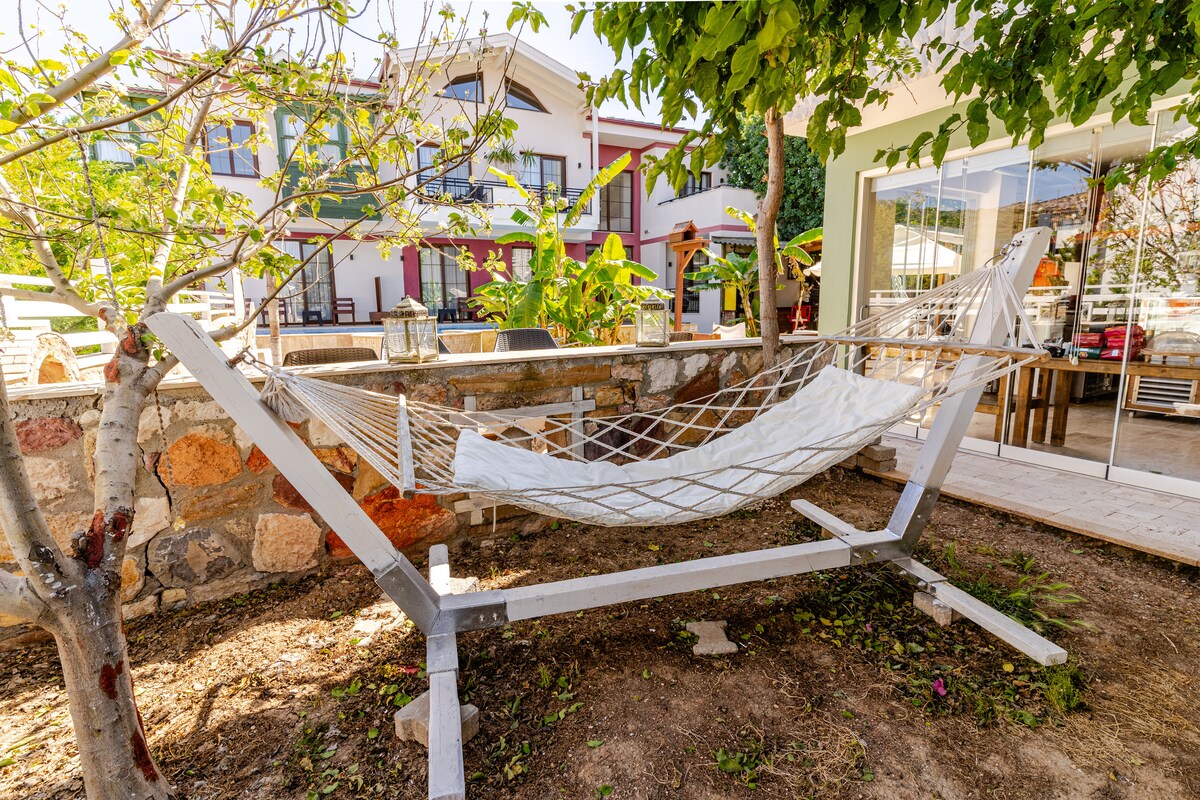 A 2 km de la playa de Sarımsaklı, a 6 km del centro de Ayvalik, a 2 km de Küçükköy, a 2 km de Küçükköy, ¿no quieres aliviar el cansancio del día en tu inmaculada habitación espaciosa con vistas al mar y al bosque lejos del ruido y el tráfico y saludarte con un magnífico desayuno preparado para ti en nuestra terraza abierta al nuevo día?