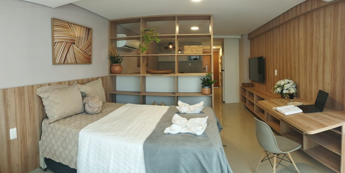 Flat completamente mobiliado, equipado e climatizado para fazer com que a sua estadia se torne uma experiência inesquecível. Localizado no empreendimento vencedor do prêmio melhor Home Service ADEMI2019 na praia de Barra de Jangada (do ladinho da Praia do Paiva) e com uma das melhores vistas para a Ilha do Amor que você poderá encontrar. Somos a união perfeita entre lazer e trabalho. O hóspede poderá usufruir de academia, sauna, piscina, lavanderia, recepção. A portaria funciona 24 horas.