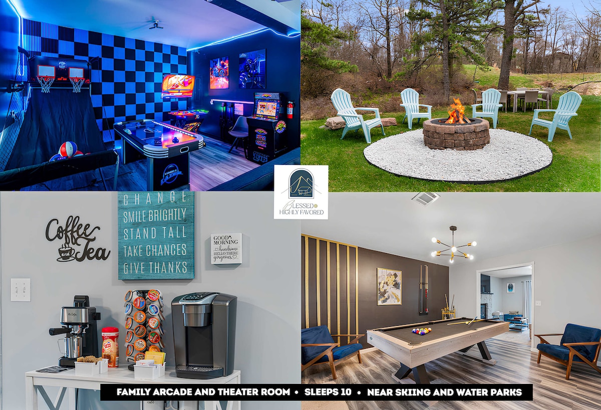 Escapada familiar de 4 dormitorios en Poconos • Arcade • Fogata