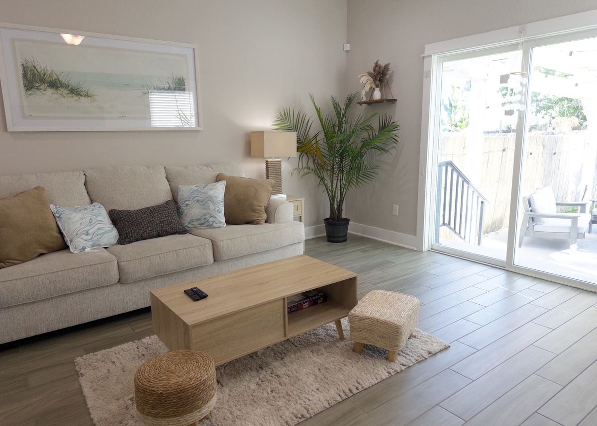 * Construido en 2023: muebles y sábanas de lujo en la costa * Destacado en la revista Good Housekeeping de 2024🌟 * 2 suites tamaño king (1 en cada piso) | 2 dormitorios tamaño queen | 3,5 baños * Piscina privada de agua salada y spa/jacuzzi. * Cabaña junto a la piscina | Cocina exterior | Porche delantero * Bicicletas, juguetes de playa, sillas de playa. * Paisajismo tropical exuberante * 0.2 millas - hermosa playa tranquila * 5,5 millas: centro histórico de San Agustín, ¡la ciudad más antigua de Estados Unidos! * 0.2 millas - Cap's Restaurant para cenar al atardecer en el agua