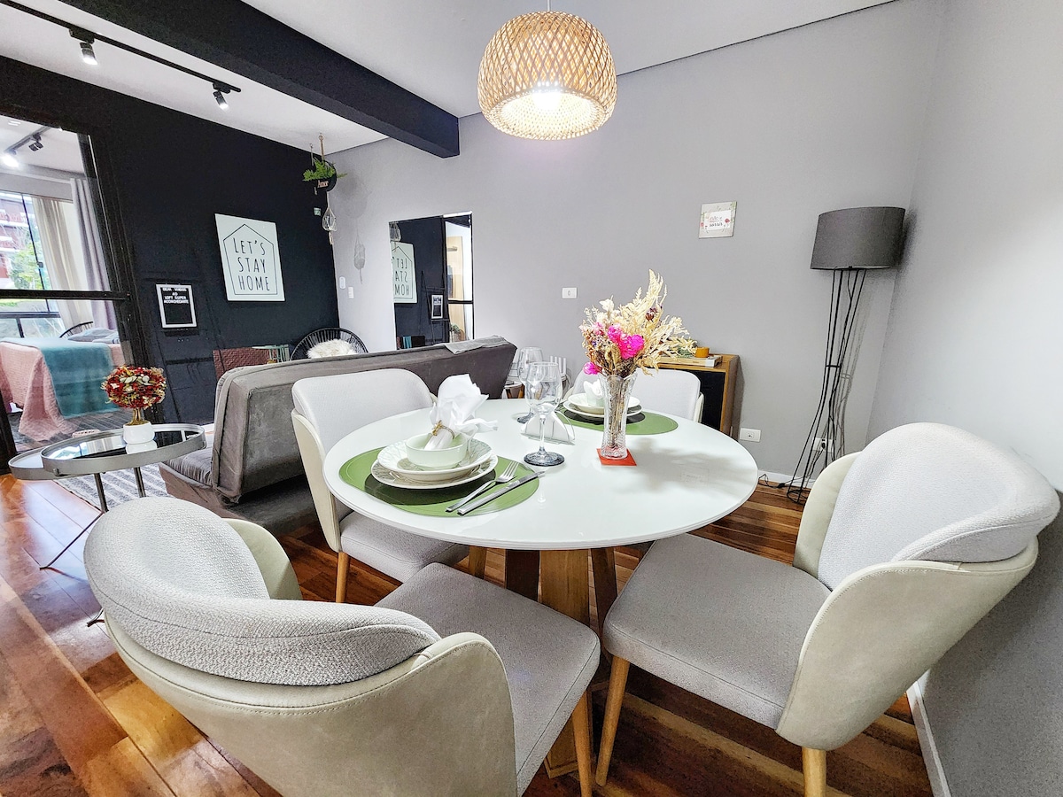 El Flat102, unidad especial de @flatscj, está totalmente equipado para un alojamiento tranquilo. Estamos ubicados en una zona privilegiada en el corazón de Campos do Jordão, cerca de todo. Estratégicamente entre el Centro Comercial y la Villa Turística de Capivari, lo que facilita el acceso y la movilidad por toda la ciudad. Puedes dejar tu coche aparcado en el edificio e ir a Capivari, en una caminata de 15 minutos, utilizando la Av Principal, que es plana, segura, arbolada, iluminada, con acera y carril bici.