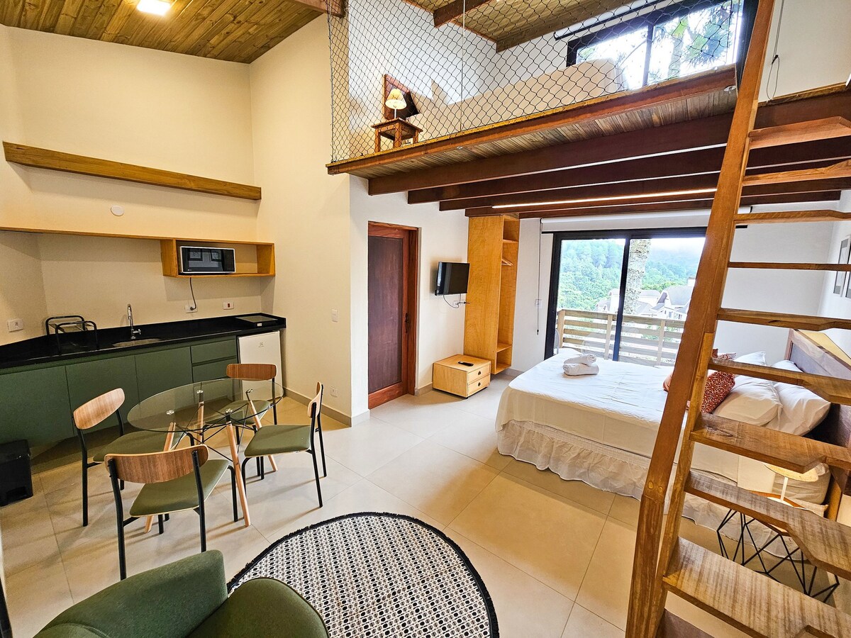 Nosso estúdio novo e moderno está localizado no coração do centro turístico do Capivari, composto por 1 suíte e 1 quarto suspenso com 1 cama de casal em cada para casais e famílias. Contamos com uma pequena sala de estar e cozinha equipada. Disponibilizamos roupa de cama e banho completo. Temos estacionamento cortesia no local. Disponibilizamos de internet wi-fi e possuímos TV smart. Contamos também com uma sala de estar de uso comum com lareira e jogos.