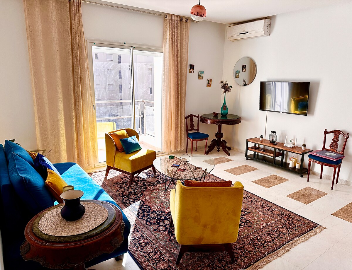 Un elegante y luminoso apartamento 3BDR mantenido con altos estándares, tres dormitorios y tres baños en una moderna residencia vigilada en uno de los mejores barrios de Túnez. Se adaptaría perfectamente a una familia o visitantes de negocios, el apartamento tiene capacidad para 8 (6 adultos y 2 niños). Los pisos están decorados con carteles de películas vintage originales de mi propia colección con cine tunecino, egipcio, libanés y sirio que data de principios de la década de 1930.