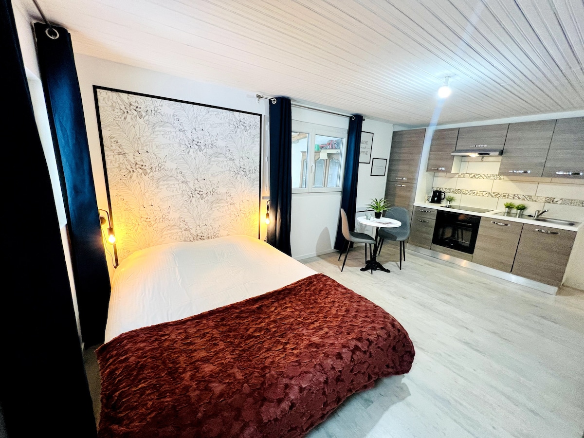 Estudio en el centro de la ciudad, a 5 minutos a pie de la estación de tren, aparcamiento gratuito en la estación de tren. Muy buen servicio, muy bien equipado, completamente renovado, en la planta baja, fondo del patio tranquilo y seguro. Capacidad para 2 personas, 1 cama queen size real con colchón de espuma viscoelástica. Apartamento para no fumadores. Llegada entre las 15:00 y las 19:00. Es posible llegar fuera de este horario, pero con un suplemento. Cuarto de baño: ducha italiana de 120 cm x 70 cm Aseo separado. Habitación: Cama de 160 cm x 200 cm, TV de 50 pulgadas Armario empotrado, Ventanas con persianas eléctricas.