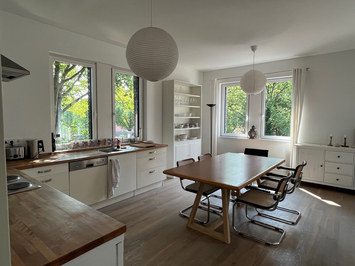 Bienvenido a los hermosos suburbios del Elba. Nuestra casa está situada en medio del campo, a poca distancia del Elba y del Jardín Botánico, y sin embargo se llega a la estación central de tren en S-Bahn en 20 minutos. Alquilamos un apartamento luminoso y acogedor en el ático de nuestra antigua casa. La cocina está totalmente equipada para que pueda cocinar cómodamente por la noche. Cuando hace buen tiempo, puede relajarse en nuestro jardín o pasear por los parques cercanos o a lo largo del Elba.