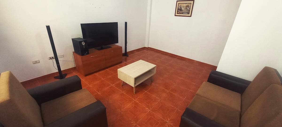 Departamento ubicado en urbanización Latina, a espaldas de un parque, a 3 cuadras del banco de la nación, SUNARP, BBVA y a 5 minutos del aeropuerto y el centro comercial Real Plaza. El departamento cuenta con 2 dormitorios, el principal con una cama de 2 plazas y un pequeño vestidor, ambas habitaciones bien ventiladas. Cocina equipada, tv, lavadora, microondas y nevera. Se proporcionan toallas y ropa de cama. Ubicado en 1 piso, Ingreso y salida independiente, sin restricción de horario.