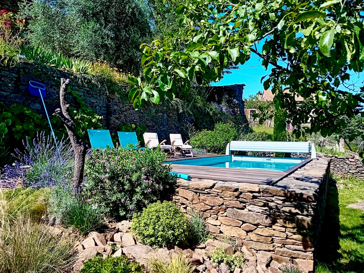 Bienvenue à la maison de Célestin, mas très isolé en pierres 120M2, en pleine Nature pour 6 personnes. Piscine privative chauffée d Avril à Septembre 10m*4 sécurisée et grande terrasse. Grand espace de vie avec cuisine donnant sur terrasse avec tonnelle 2 chambres doubles partageant une salle de bain avec douche italienne 1 suite avec Lit King size et salle de bain. 1 Salle de jeux avec couchage double (pièce non chauffée) !!! accès derniers km par chemin privé non goudronné!!!