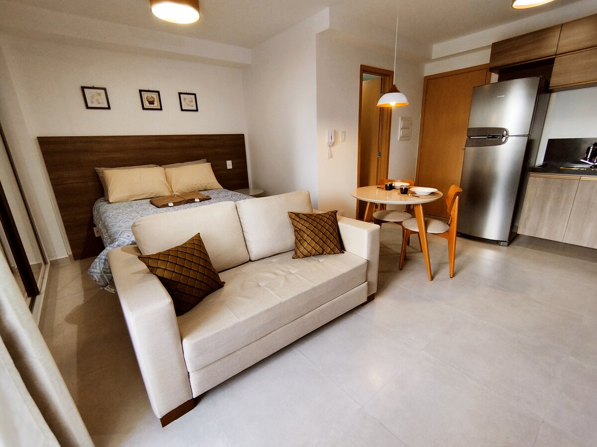 Apartamento tipo estudio nuevo con garaje. Todo el mobiliario es nuevo y está diseñado para brindar la máxima comodidad a nuestros huéspedes. Muy bien ubicado con todo cerca, en plena Av. Itamar Franco, casi en la esquina con la Av. Br. Rio Branco en el corazón de la ciudad! ¡Ideal para su oficina en casa combinada con el ocio! Con una completa zona de ocio con piscina, gimnasio, zona gourmet, coworking, espacio kids y lavandería. ¡Disfrute de una experiencia sin igual en este estudio bien ubicado con garaje!