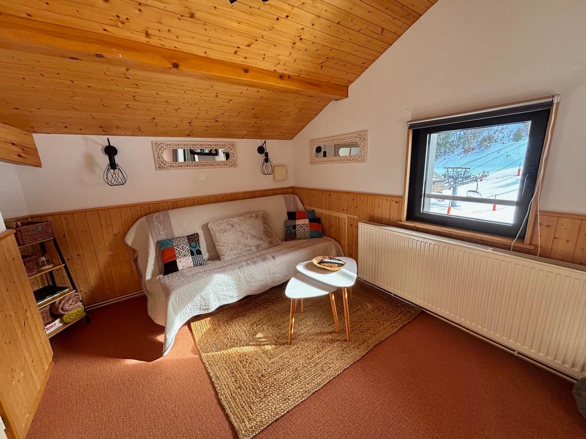 (In chapter "Experience" some ENGLISH explanations) ALQUILER ALTO JURA - ESTACIÓN FAMILIAR LES PELIRROJAS Este amueblado "no fumador", para 4 personas en pleno centro del pueblo le da la bienvenida en 26 m². Último piso (3º y ascensor), el salón/cocina con su ventanal y su amplio balcón le ofrecen una vista aérea del centro de Les Rousses y la puesta de sol. El sofá esquinero es convertible. En la entrada 2 literas (colchón de espuma) para el resto de la familia. ROPA DE CAMA Y LIMPIEZA NO INCLUIDOS.
