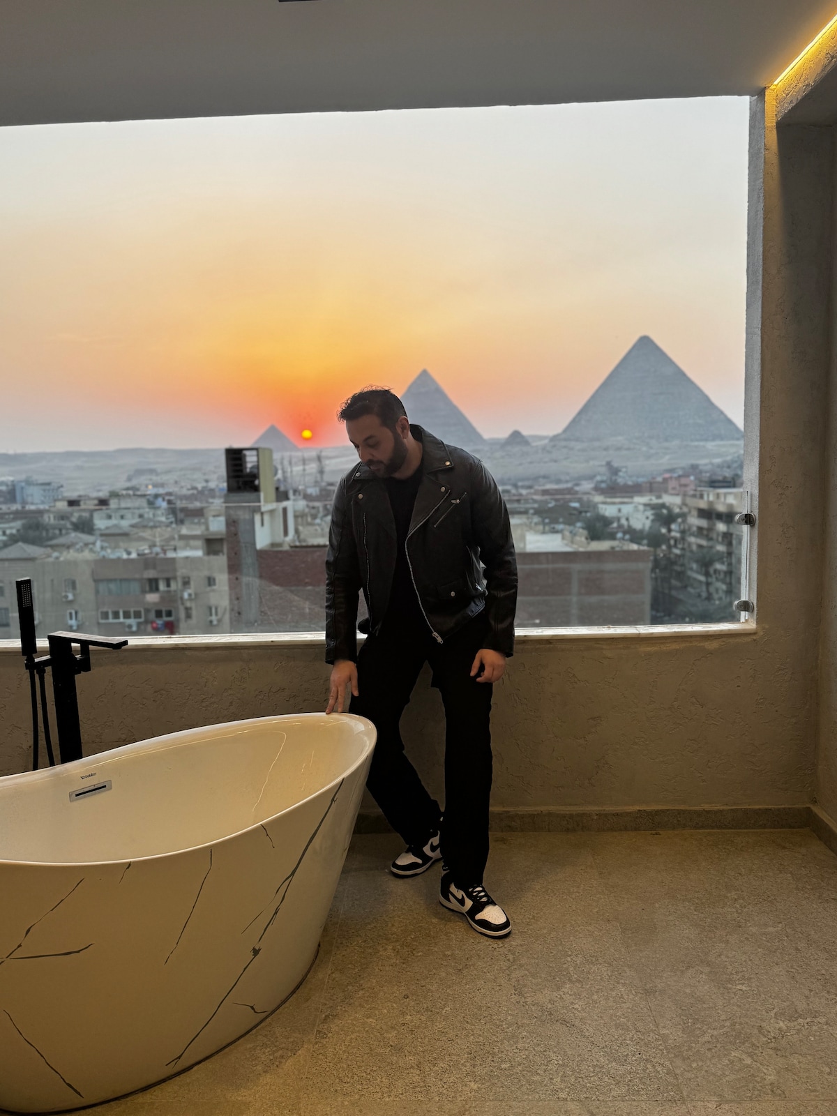 This stunning design 3 bedroom apartment enjoys the view of Great Giza Pyramids along with great bathtubs Please note that this unit is located in a local and modest neighborhood. Guests staying should expect that the surrounding areas to the building are not of high standards Please note that Arab and Egyptian citizens are required to submit proof of marriage before check in. The space This fascinating 3 bedrooms apartment is located in Giza's district which the closest to the Giza Pyramids.