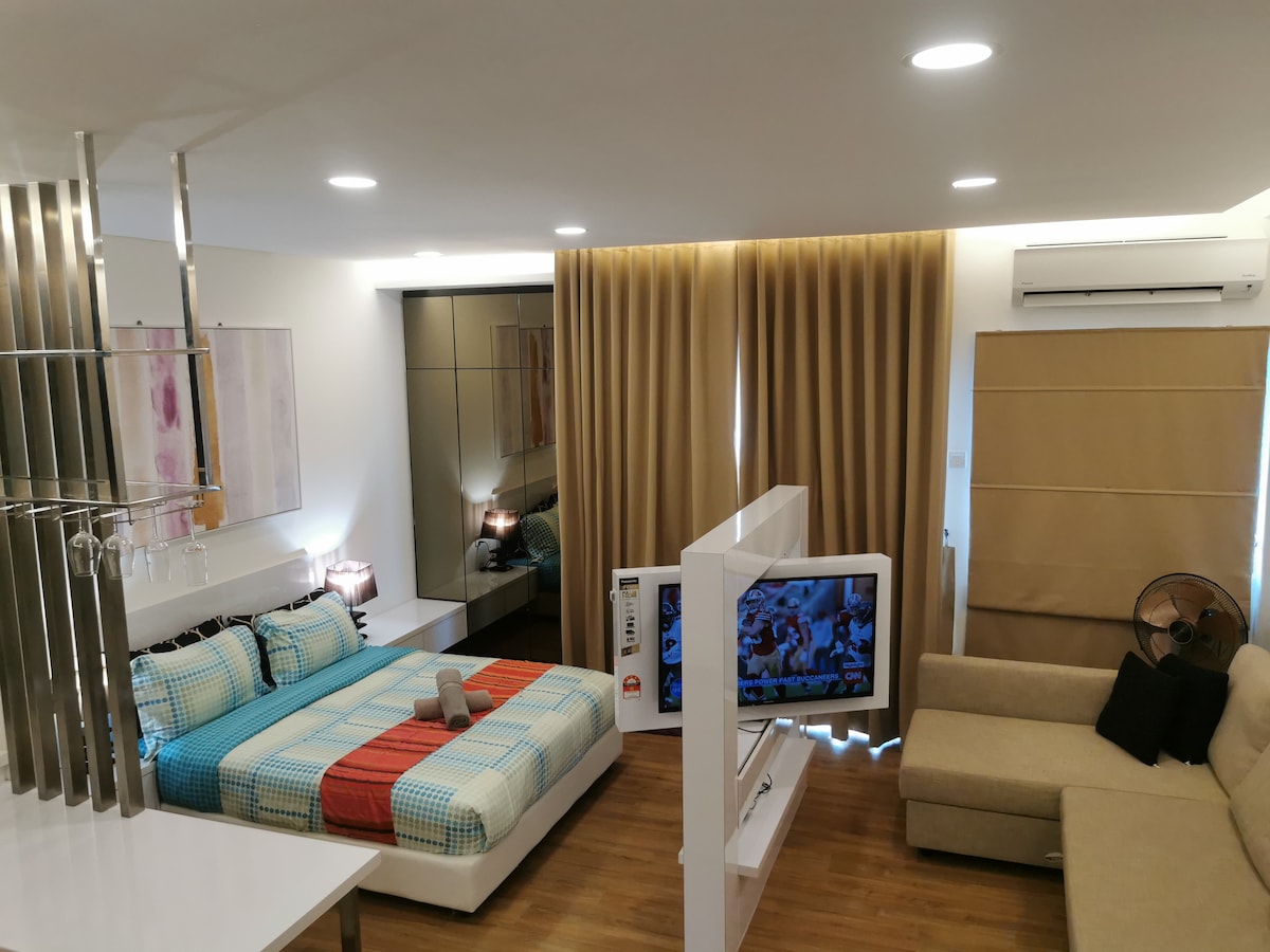 Ubicado en el corazón de Bangi y en la parte superior del centro comercial EVO, donde se alquilan famosos outlets y restaurantes; Parkson, Daiso, A&W, Fish Manhattan, Sushi King, Big Apple, etc. Cerca hay varios lugares populares: - Centro de moda y boutiques (a poca distancia a pie) - Centro comercial IOI City Mall - Putrajaya, Cyberjaya - UKM, UPM, UNITEN - MAEPS Serdang (MAHA). - Hospitales Zahrah y Annur. Muy práctico para viajeros de negocios y escapadas familiares. Hay piscina y gimnasio disponibles. Aparcamiento interior GRATUITO.
