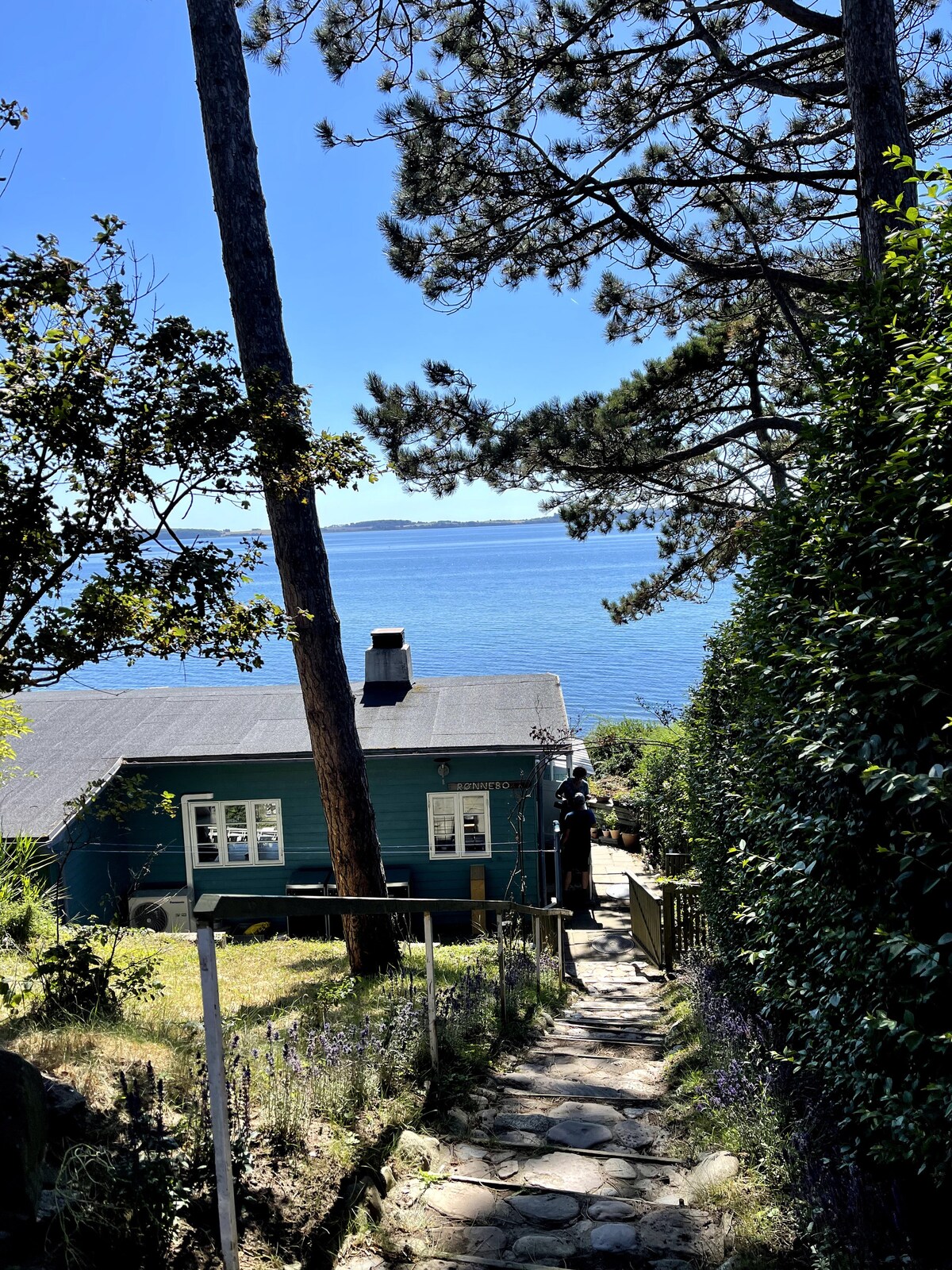 Cuando bajas las escaleras a esta casa de campo azul turquesa, es como si estuvieras entrando en otro mundo. Aquí hay paz, privacidad y vives en medio de la naturaleza. El jardín es el hogar de lagartos y está plantado con muchos rosales diferentes que dan el aroma más maravilloso en verano. En los días sin viento, puedes oír el aleteo de las alas de los pájaros y, si escuchas con atención, también puedes oír a las marsopas que nadan a lo largo de la costa por la noche.