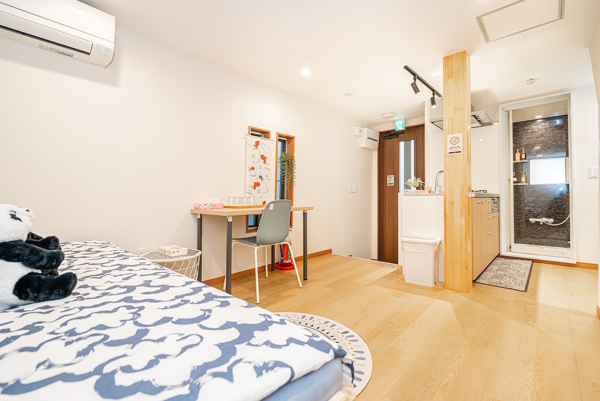 Este alojamiento es ideal para disfrutar de una estancia de larga duración con la familia o los amigos. Es un apartahotel que abrió sus puertas en 2023 y está situado en una tranquila zona residencial cerca del centro de la ciudad. Hay un parque, un santuario y un estanque en los alrededores. El espacioso interior de 35 m² tiene un diseño de estilo japonés. Hay una cama queen y tres futones, con capacidad para cinco adultos. (Los niños menores de 2 años duermen gratis en la cama con sus padres). Hay una cocina compacta con capacidad para cocinar, una lavadora-secadora totalmente automática, un baño de gran tamaño y un aseo independiente. También cuenta con Android TV y wifi gratuito, por lo que es un entorno adecuado para pasar el rato o trabajar en el interior. También puedes relajarte en la azotea abierta a los huéspedes. El check-in se realiza mediante un sistema de check-in sin restricción de horario que utiliza una tableta, por lo que no hay que preocuparse por llegar a altas horas de la noche. La puerta se controla con el último sistema de llave táctil. Se encuentra a 5 minutos a pie de la salida de la estación más cercana (estación Sumiyoshi, línea Hankyu, línea Toei Shinjuku), y hay un supermercado cerca. Relájese con su familia en este tranquilo alojamiento.