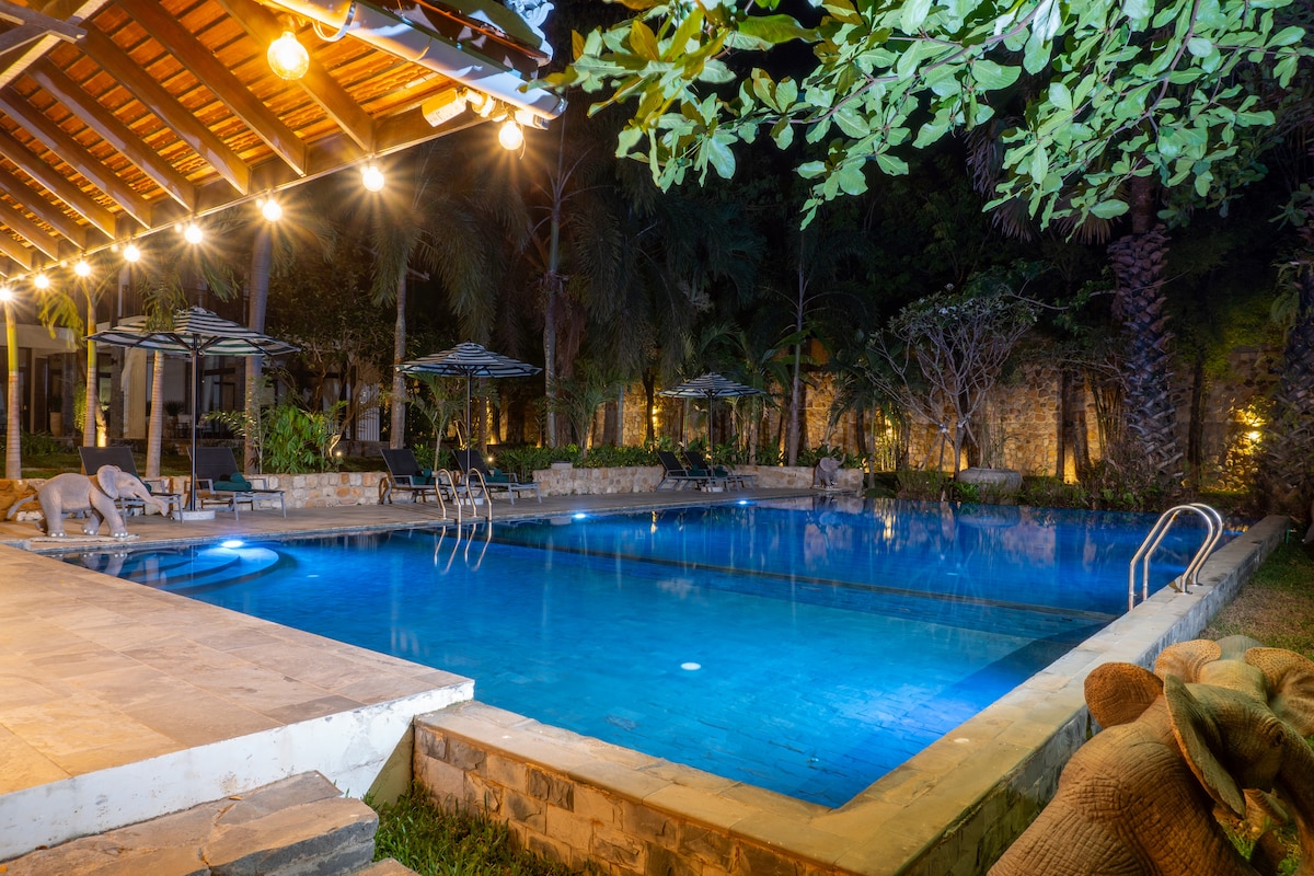 Relájate en este espacio tranquilo y elegante. Alójate en nuestra villa de 5 camas y 4 baños en Kep diseñada con tranquilidad y un refugio inolvidable para familias, amigos o grupos grandes. Perfecto para 12-20 huéspedes. Ubicada en la carretera principal de Kep, pero diseñada para la privacidad, la paz y la seguridad, disfruta de una gran piscina con una pérgola para cenas estrelladas, barbacoa y cocina completa, y exuberante vegetación. Rodeada de árboles, es una escapada perfecta para familias y grupos. ¡Reserva ahora para disfrutar de una estadía tranquila e inolvidable!