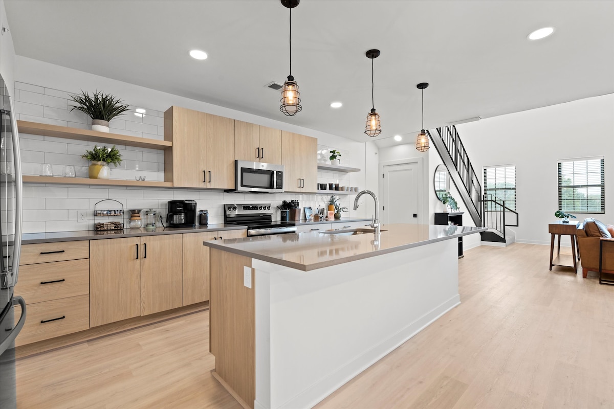✨ 2 dormitorios • 2 baños y medio • Capacidad para 4 personas ✨ Moderno loft de 3 pisos en el nuevo Blume NKC ✨ Suites queen con baño privado en la habitación ✨ Ventanas de dos pisos + balcón privado para estar en interiores/exteriores ✨ Cocina elegante con isla extragrande + barra de café completa ✨ Smart TV, wifi de alta velocidad y lavadora/secadora en la unidad ✨ Garaje privado + estacionamiento en la entrada ✨ A minutos de Chicken N Pickle, River Market y el centro de Kansas City