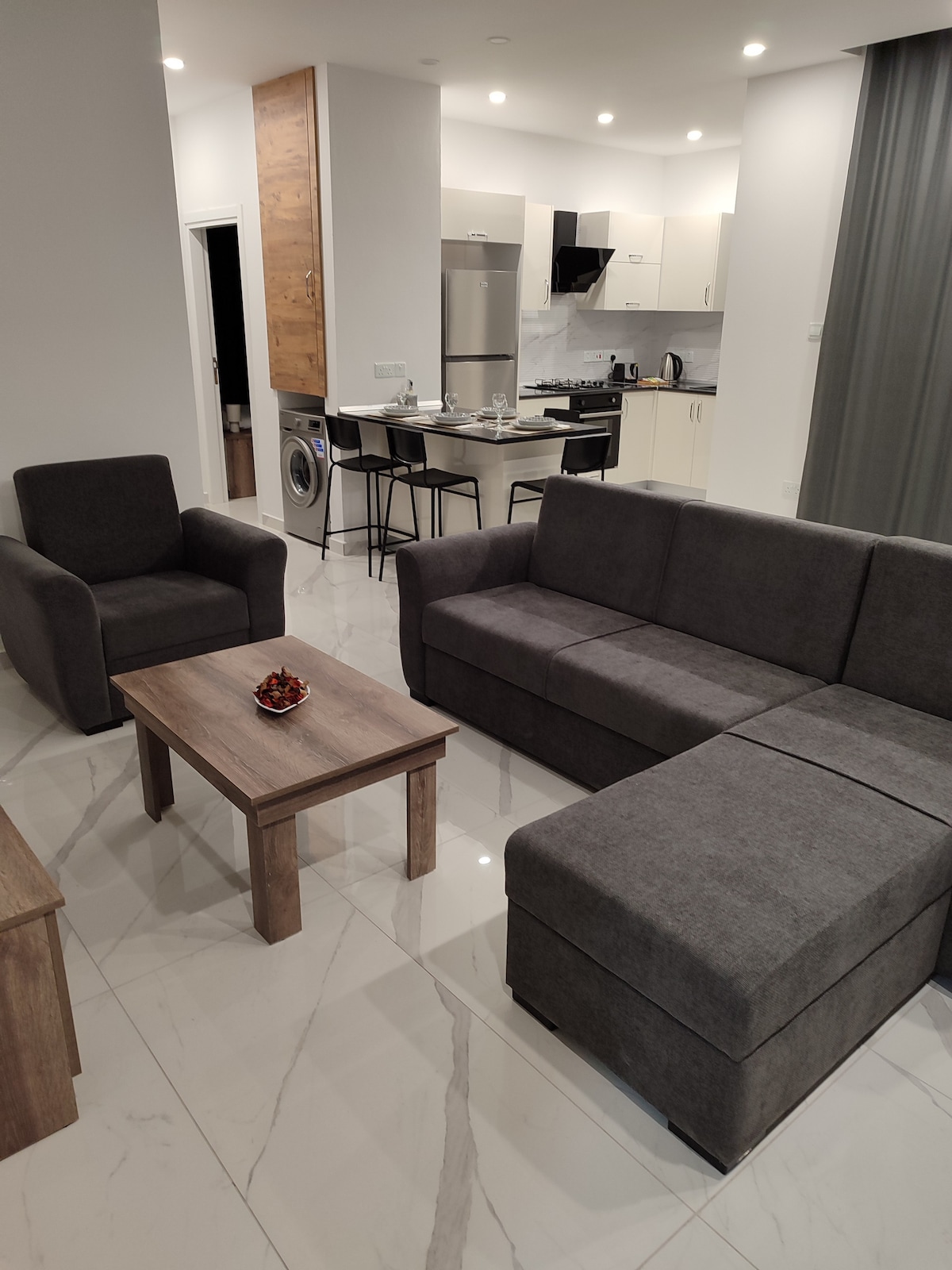🏡 Konaklama Alanı Yeni inşa edilmiş modern 2+1 dairemiz, Girne şehir merkezinin kalbinde yer alıyor. Ferah yaşam alanları, modern mobilyalar ve şık dekorasyon ile konforlu bir konaklama sunar. Bilginize sunmak isteriz ki aynı daireden toplamda 16 adet bulunmaktadır ve tüm daireler birebir aynı olup hiçbir fark bulunmamaktadır. Gönül rahatlığıyla konaklayabilirsiniz, tüm dairelerimiz aynı standart, donanım ve özenle hazırlanmıştır. Keyifli bir konaklama dileriz.