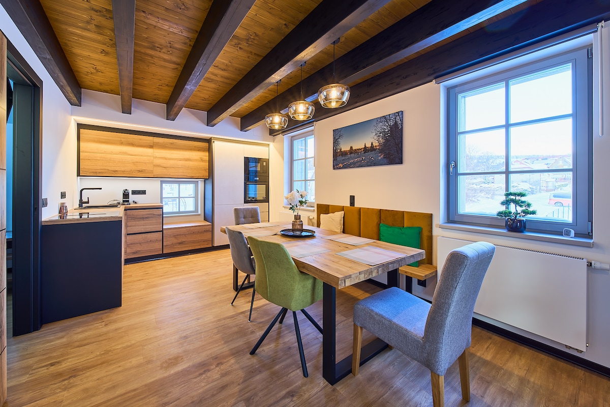 El apartamento Heidi es un nuevo departamento boutique situado en Loučná pod Klínovcem. El apartamento está amueblado con un alto nivel para garantizar el máximo confort para los huéspedes. El salón, el dormitorio principal y el balcón ofrecen impresionantes vistas a la montaña. La cocina de tamaño completo tiene todo lo que necesitas durante tu estadía (incluido un lavavajillas y lavadora secadora). Una máquina Nespresso es una cuestión, por supuesto. El apartamento tiene un lugar de estacionamiento en el garaje donde puedes aparcar de forma gratuita durante tu estancia.