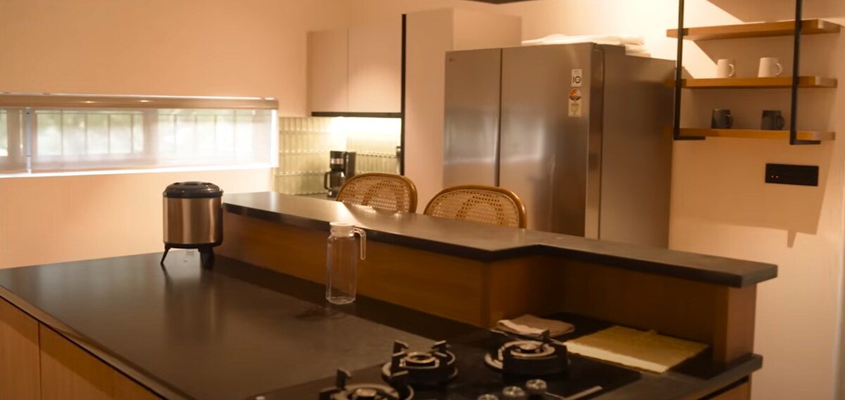 2BHK - Villa privada con cocina La casa cuenta con una amplia sala de estar de planta abierta equipada con un cómodo sofá, TV, comedor y cocina americana, que te ofrece mucho espacio para relajarte y entretenerte. Mientras disfrutas de las noches de brisa en el porche delantero, puedes ver cómo el cielo se transforma en un impresionante lienzo de púrpuras y rosas, ya que ofrece adiós al sol. Durante el día, podés salir a tomar el sol, hacer castillos de arena o simplemente descansar en la playa.