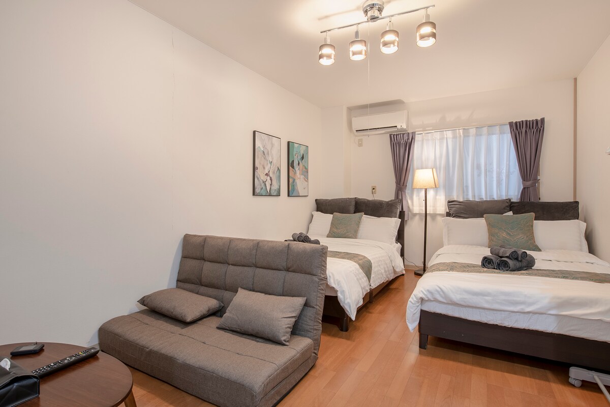 Es conveniente para toda la familia ir a cualquier lugar en este lugar céntrico. La habitación cuenta con dos camas king, por lo que es ideal para familias y grupos de amigos. El espacio entre las camas es cómodo, y la distribución permite mantener una zona privada.Adecuado para que duerman hasta 5 personas. La cocina abierta está equipada con una cocina de inducción, ollas, sartenes y platos, para que puedas preparar fácilmente comidas caseras o platos japoneses sencillos. La barra del bar conecta el living con el comedor, por lo que es perfecta para cualquier cosa, desde el café de la mañana hasta la cena. El lavamanos y el baño están diseñados por separado, por lo que, aunque se alojen varias personas juntas, cada una puede seguir su propio ritmo. Disfrutar de un equipo de música con Bluetooth, escuchar música y tomar un baño caliente por la noche en Japón es el momento más relajante del viaje. La sala cuenta con un proyector que se puede conectar con facilidad a las plataformas de streaming digital más populares. Totalmente equipado con lavarropas, purificador de aire, plancha y un placard espacioso, tenemos todo lo que necesitás. El espacio es ideal, perfecto para que una persona trabaje en paz en la barra del bar, o para pasar unos días con amigos o familiares. Nos lo pasamos muy bien y todo el mundo se sintió a gusto.