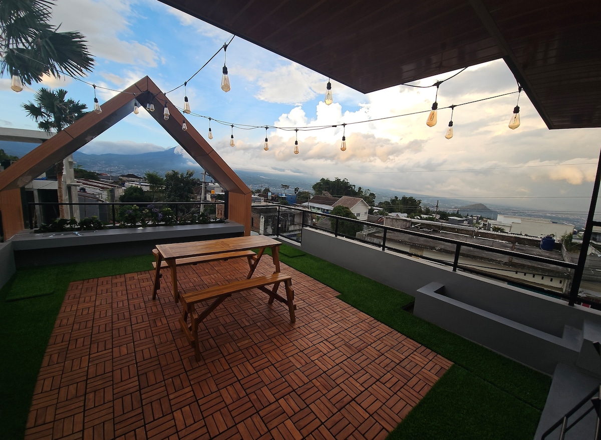 Bersantailah bersama seluruh keluarga di tempat menginap yang tenang ini sambil menikmati pemandangan city of light diatas roftop yang nyaman dan estetik