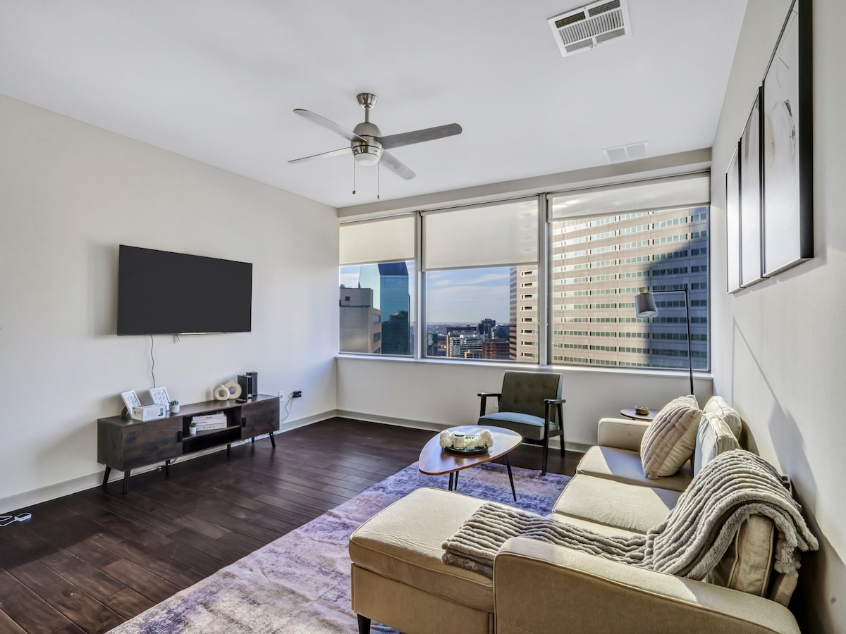 ¡Te damos la bienvenida a nuestro increíble rascacielos del centro de Dallas! Disfruta de una experiencia elegante en nuestro alojamiento en el corazón del centro de la ciudad. Muy cerca de varios restaurantes y de todos los espacios para eventos. Disfruta de unas vistas increíbles a través de nuestras ventanas del suelo al techo o relájate en el gran balcón. Viene con estacionamiento gratuito en el garaje, cocina completa y todas las comodidades que un apartamento de lujo tiene para ofrecer.