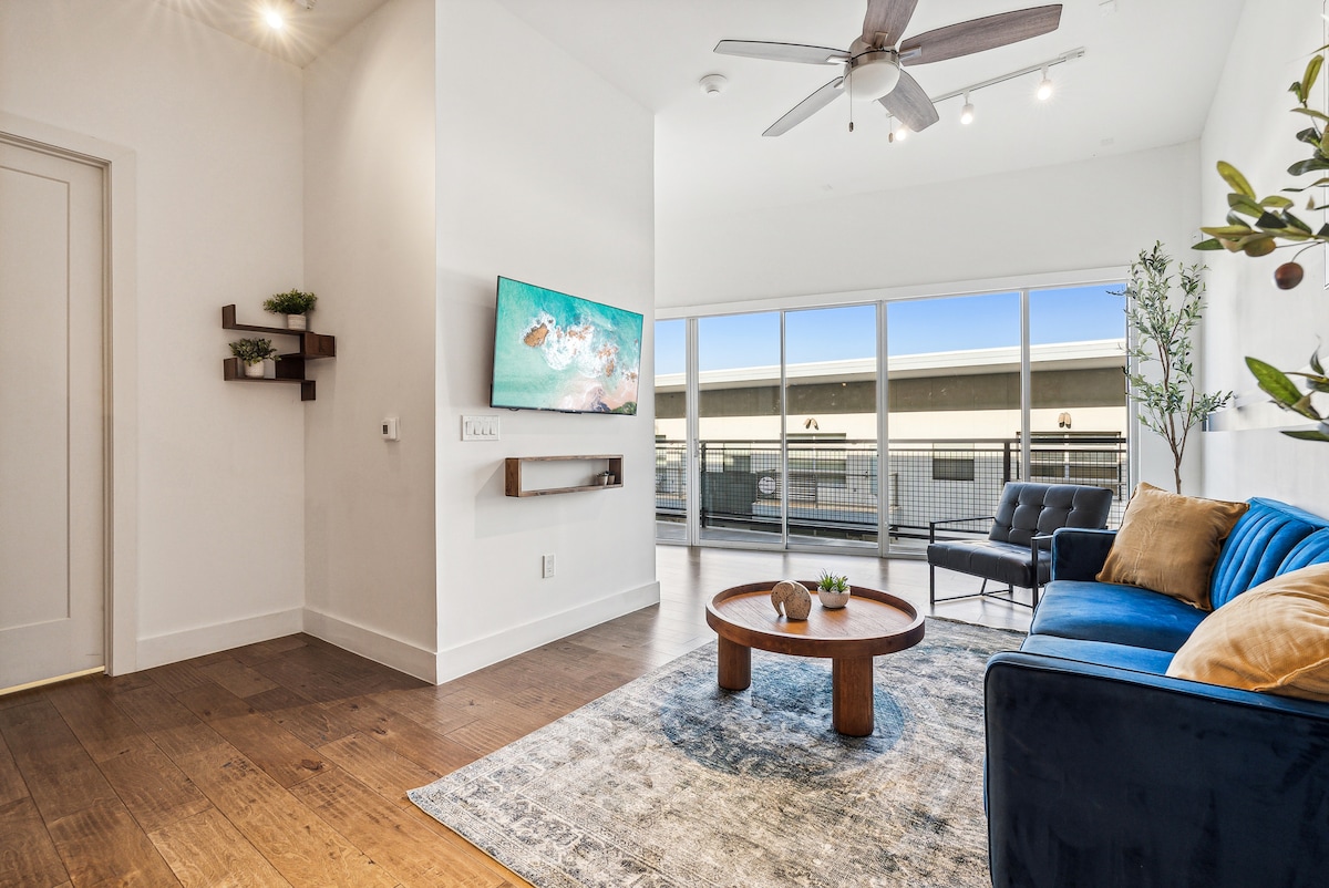 Luminoso y moderno loft industrial en el corazón de Dallas, ideal para hasta 5 huéspedes. A pocos pasos del Centro de Convenciones Kay Bailey Hutchison, este refugio urbano cuenta con 2 camas tamaño king, una cocina totalmente equipada y estacionamiento gratuito. Ideal para viajeros de negocios, asistentes a convenciones y exploradores de la ciudad que buscan una estadía elegante y conveniente con fantásticas comodidades en el edificio, como una piscina y un gimnasio.
