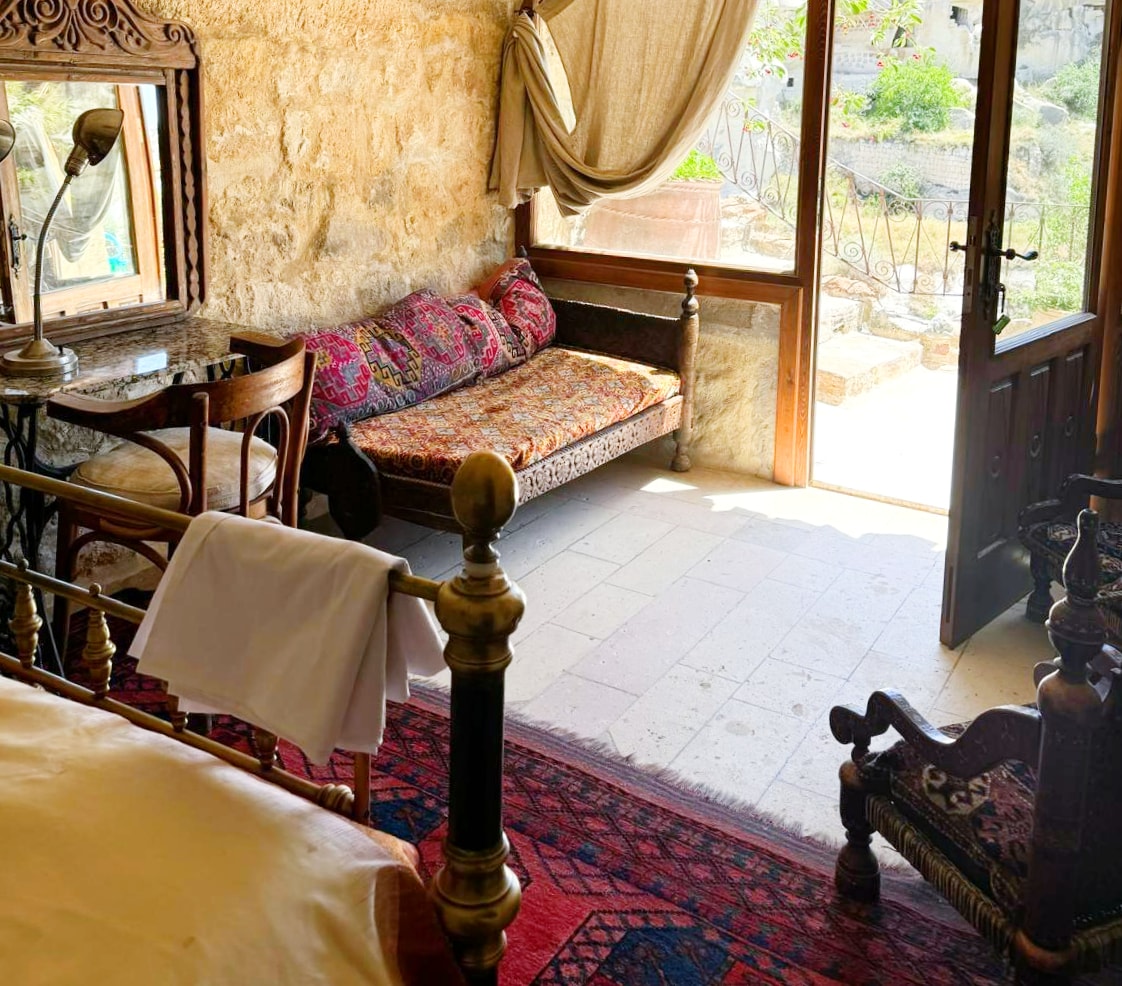 Inspirado por el amor al estilo turco y la facilidad del diseño moderno, nuestro de piedra es luminoso y espacioso, con balcón de Julieta, dormitorio con cama tamaño queen y baño privado, amplio salón con detalles llamativos, además de sofá cama y una cama individual/de día súper cómoda ideal para relajarse entre las almohadas kilim. Arriba hay una cocina/comedor totalmente independiente, un aseo adicional y una terraza bañada por el sol. Perfecto para cenar al aire libre y disfrutar del ambiente del pueblo después de disfrutar de Capadocia.