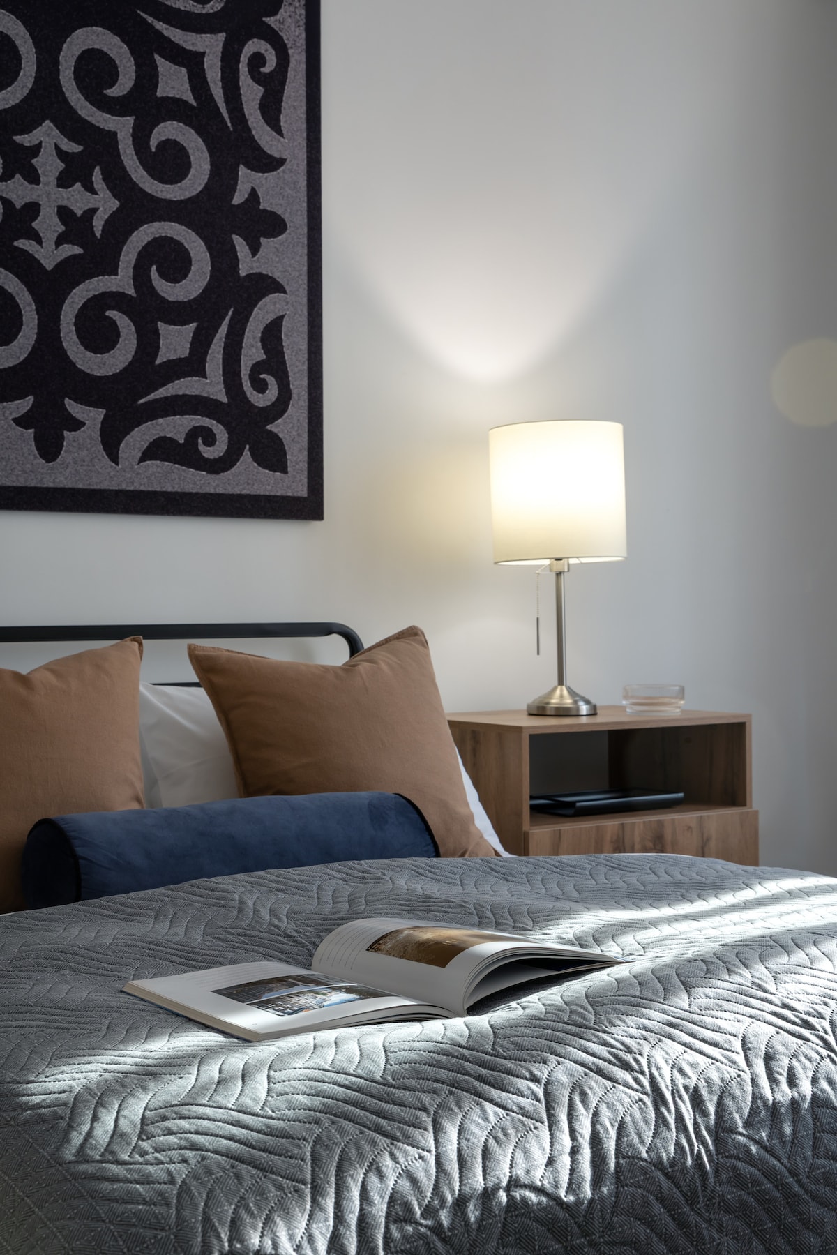 Casa de clase de negocios del complejo residencial Lamiya, estudio de 3 habitaciones, estilo loft, 5to piso de 12, 2 dormitorios, 2 baños. En el departamento pueden alojarse 6 personas(parejas). Y también el apartamento tiene cerradura inteligente, TV inteligente, 2 aires acondicionados, 1 ventilador, lavavajillas, en general hay de todo para una estancia confortable. Hay un aparcamiento, parque infantil cerca. El complejo residencial cuenta con una tienda de comestibles Magnum, 5 cafeterías y un gimnasio INVICTUS GO. El residencial se encuentra cerca del estadio central, circo, teatro, estación de metro Baikonur.
