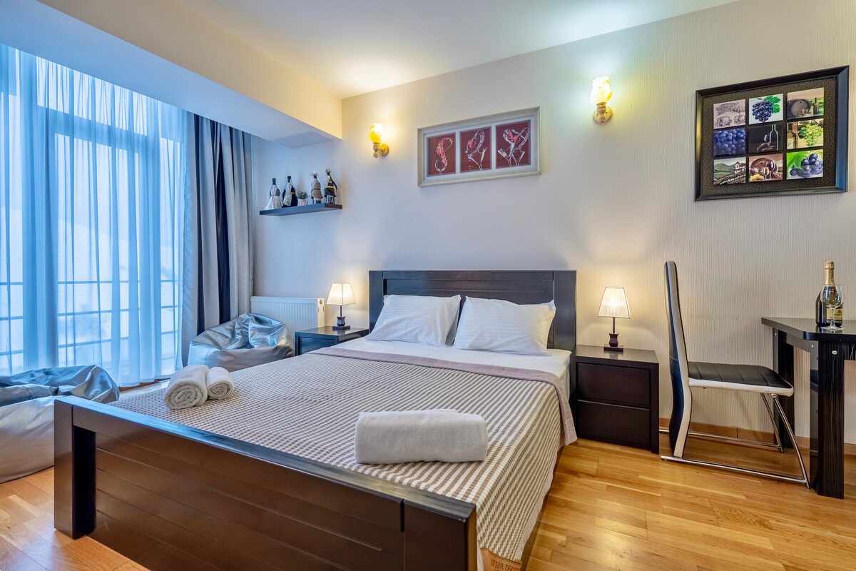 This beautiful Apartment is located in Heart of New Gudauri, walking distance from the main Ski lift, "Gondola"! A queen-sized bed with sleep-promoting mattress and comfy double-sized sofa , with a fully stocked kitchenette for home cooking, board games and amazing cozy atmosphere.