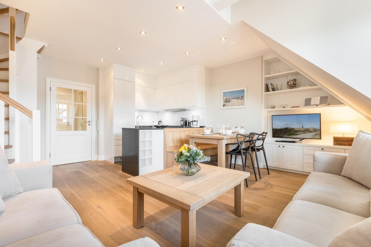 Departamento luminoso de 1 dormitorio de estilo nórdico en el segundo piso con parquet de madera real, cocina equipada, baño y balcón orientado al sur con silla de playa. En el corazón de Wenningstedt, cerca del estanque del pueblo, muchas tiendas (panadería en la planta baja de la casa, delicatessen cerca) y excelentes restaurantes. ¡Gosch y la playa están a pocos pasos (5-10 minutos)!Hay una parada de autobús justo afuera de la puerta de entrada. El check-in es a partir de las 4:00 p. m. y el check-out a las 10:00 p. m.