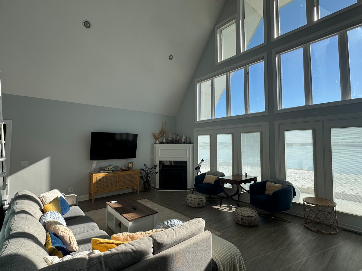 ¡Disfruta de una vida tranquila frente al lago en esta acogedora casa Aframe con vistas espectaculares! Despiértate cada mañana con el sol saliendo sobre el lago, luego llena el día jugando en tu propia playa de arena privada, haciendo kayak, pescando o observando aves. Da un corto paseo hasta el lago más profundo para darte un refrescante baño o ve a caminar por el parque estatal de Bay Tree Lake, que está a la vuelta de la esquina. ¡Prepara una comida fabulosa en la gran cocina abierta y termina la noche con s'mores junto al fuego y estrellas increíbles!