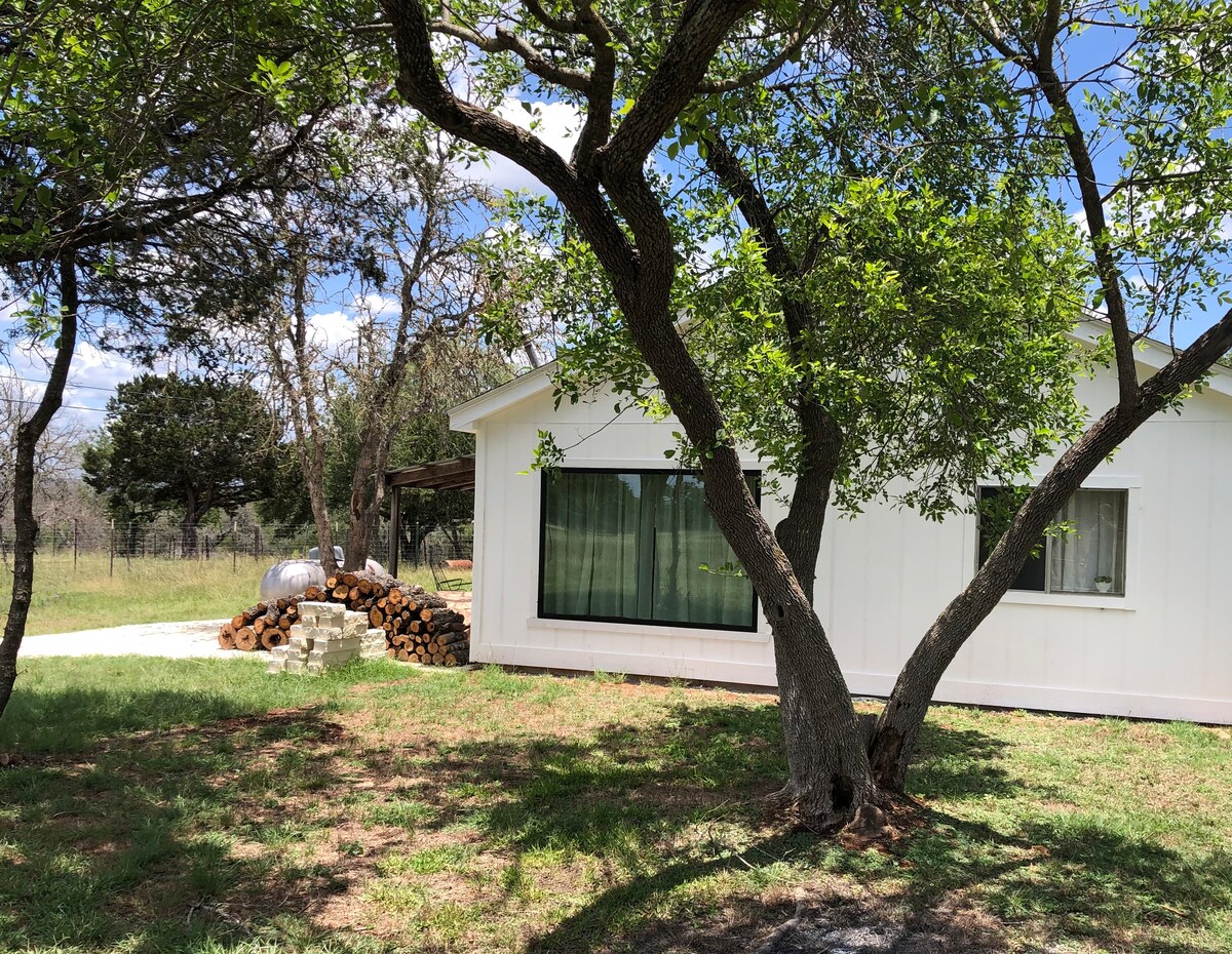 Escape to the tranquil 6-acre ranchette in Hill Country! Mins from Old Tunnel State Park, Luckenbach Dance Hall, and 290 Wine Trail. Blue Moon is your cozy, private tiny home retreat. Queen bed, TV, kitchenette w/mini-fridge/freezer, shower & small bathroom. Watch wildlife through the large sliding glass door. Say hi to our resident Llama, goats, and horse! 3 cabins on site, strategically placed for privacy. On-site Steward, Amy, available for questions but respects privacy. Dogs welcome.